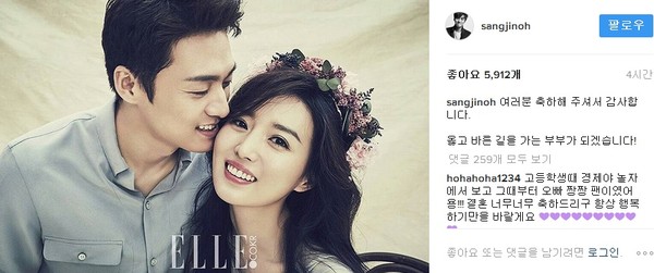 이와 관련, 오상진은 자신의 인스타그램에 "여러분 축하해 주셔서 감사합니다. 옳고 바른 길을 가는 부부가 되겠습니다"라는 글과 함께 김소영 아나운서와 함께 촬영한 엘르 화보 한 컷을 공개했다.