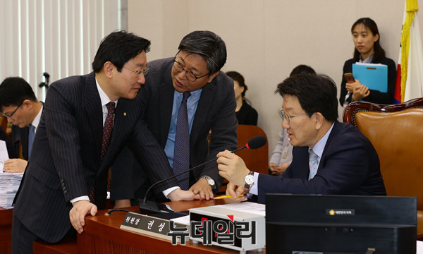 권성동 법사위원장 22일 오전 국회에서 열린 법제사법위원회 전체회의에서 박범계 더불어민주당 간사와 대화를 나누고 있다.