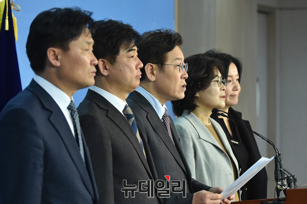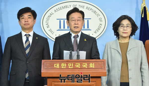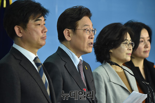 대선출마를 선언한 더불어민주당 이재명 성남시장이 8일 오후 국회 정론관에서 '특검 연장과 재벌수사 확대를 촉구'하는 기자회견을 갖고 있다.