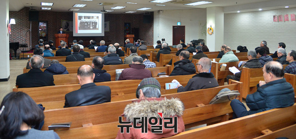 박석흥 대한언론주필 겸 편집위원장이 21일 오후 서울 중구 정동제일교회 아펜젤러홀에서 열린 제72차 이승만포럼에 발표자로 나서 이승만 건국 대통령의 4.19전야 '잃어버린 3년을 찾아서'를 주제로 발표하고 있다.