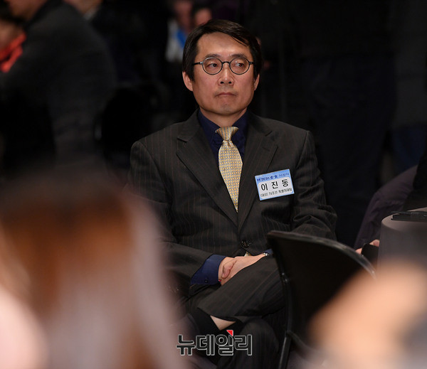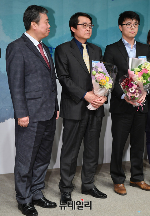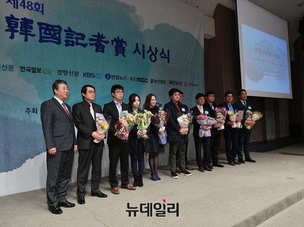 이진동 TV조선 특별취재부 부장이 23일 오전 한국프레스센터에서 열린 제48회 한국기자상 시상식에서 대상을 수상하기 위해 기다리고 있다. 올해 한국기자상 대상에는 △미르·K스포츠재단 권력형비리의혹을 보도한 TV조선 특별취재팀 △최순실 국정개입사건을 보도한 JTBC 특별취재팀 △ 최순실게이트를 보도한 한겨레신문이 공동 수상했다.