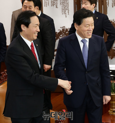 여야 4당 원내대표와 정세균 의장이 23일 오전 국회에서 특검 수사기간 연장 논의를 위해 모인 가운데 더불어민주당 우상호 원내대표와 국민의당 주승용 원내대표가 악수를 나누고 있다.