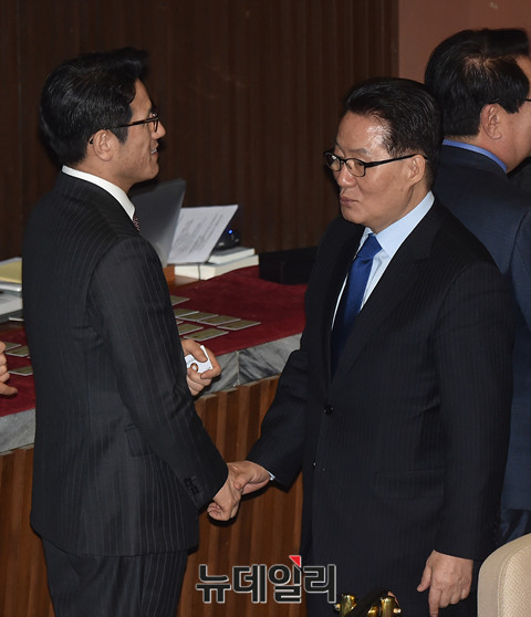 박지원 국민의당 대표와 정병국 바른정당 대표가 23일 오후 국회에서 열린 본회의에서 인사를 나누고 있다.