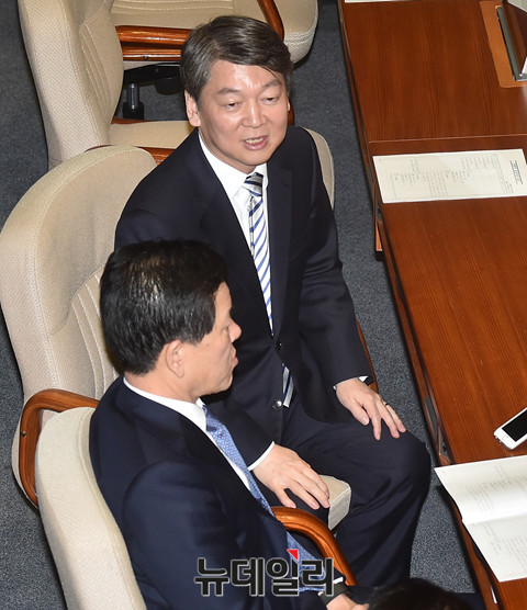 주승용 국민의당 원내대표가 23일 오후 국회에서 열린 본회의에서 안철수 의원과 대화를 나누고 있다.