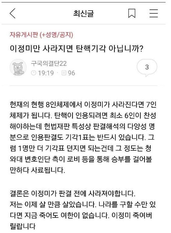 글쓴 이는 해당 글에서 "자신은 이제 살 만큼 살았고 나라를 구할 수만 있다면 지금 죽어도 여한이 없다"며 나이가 많은 '노년층'임을 강조한 뒤 "헌법재판소의 현행 8인 체제에서 이정미 권한대행이 사라진다면 7인 체제가 돼 박근혜 대통령에 대한 탄핵이 기각될 가능성이 높아진다"며 "이정미 죽여버릴랍니다"라는 극단적인 말을 내뱉었다.
