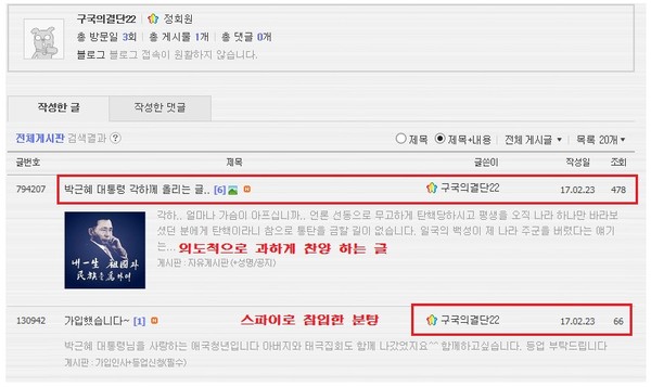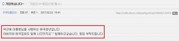 실제로 박사모 카페를 살펴보면 23일 오후 6시 41분 '구국의결단22'라는 아이디를 쓰는 네티즌이 "박근혜 대통령님을 사랑하는 애국청년입니다. 아버지와 태극집회도 함께 나갔었지요^^ 함께 하고 싶습니다. 등업 부탁드립니다"라는 글을 올린 것을 볼 수 있다.