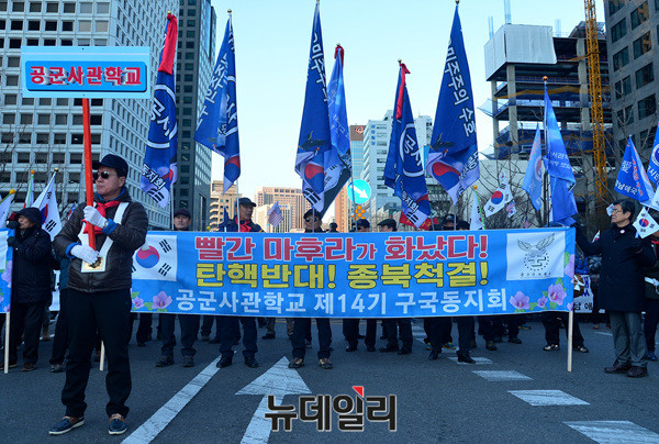 공군사관학교 예비역 장교단이 25일 오후 서울광장에서 열린 대통령탄핵기각을위한국민총궐기운동본부(탄기국) 제14차 태극기 집회 가두행진에서 "빨간마후라가 화났다! 탄핵반대! 종북촐격!" 현수막을 들고 가두행진을 하고 있다.
