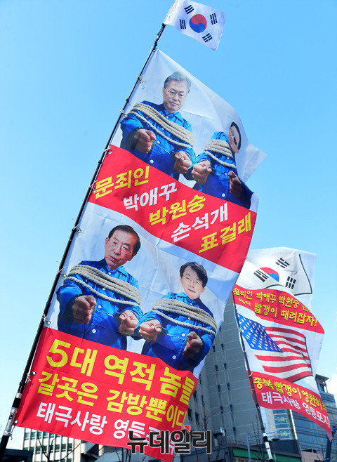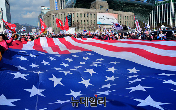 대통령탄핵기각을위한국민총궐기운동본부(탄기국)가 25일 오후 서울광장 일대에서 제14차 태극기집회를 개최한 가운데 서울광장 앞 대형성조기가 펼쳐졌다.