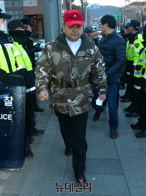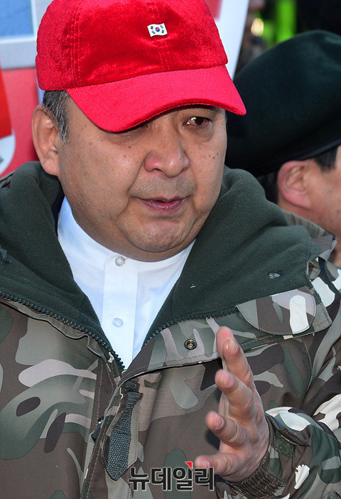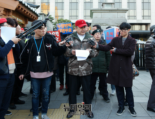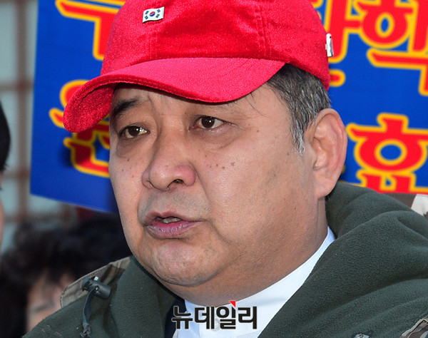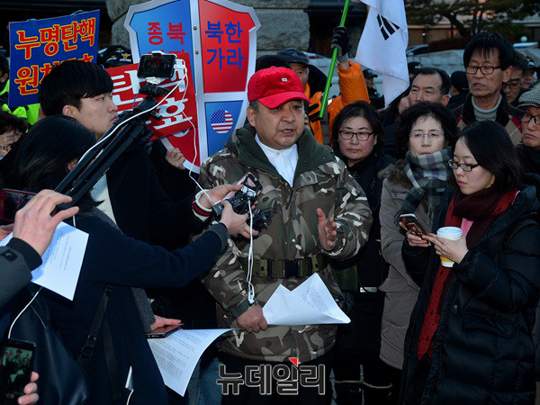 정광용 대통령탄핵기각을위한국민운동본부(탄기국) 대변인이 27일 오후 서울 종로구 헌법재판소 앞에서 기자회견을 개최했다.