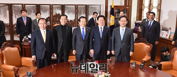 야4당 원내대표가 28일 오후 국회 의장실을 찾아 정세균 의장에게 특검법 개정안 직권상정을 요구하기에 앞서 기념사진을 촬영하고 있다.