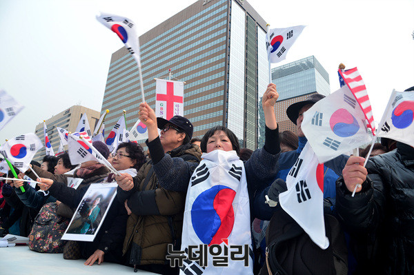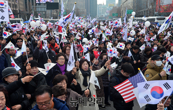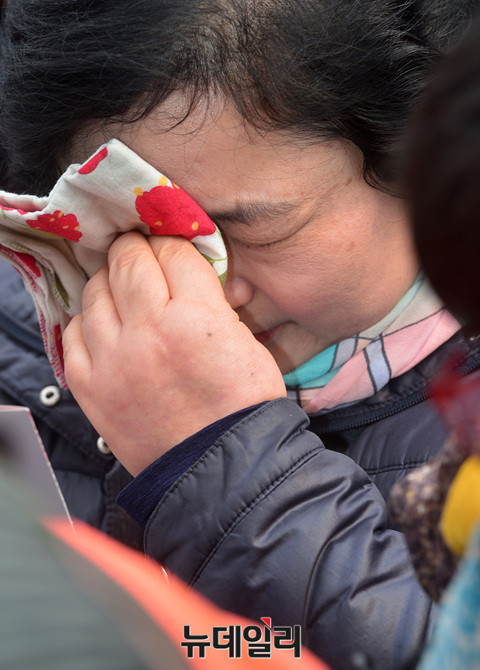 3.1만세운동 구국기도회에 참가한 한 시민이 1일 오전 세종로사거리에서 눈물을 닦고있다. 이날 오후 2시부터 같은 장소에서 탄기국이 주최하는 15차 태극기 집회가 이어진다. 오후 5시쯤 부터 '탄핵 원천 무효' 등의 구호를 외치며 청와대 및 헌법재판소 방면으로 가두행진을 이어 갈 예정이다.