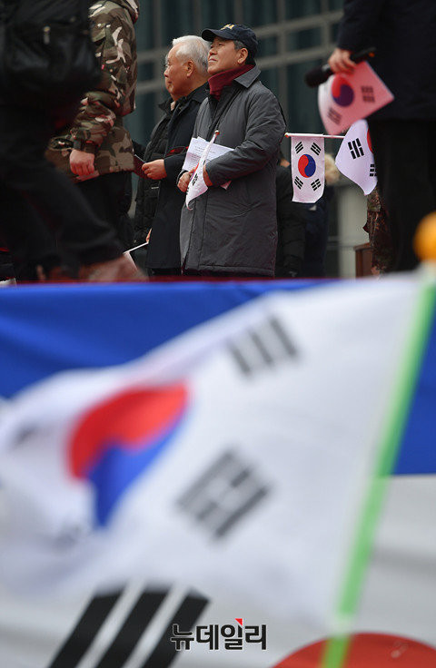권영해 탄기국 공동대표가 탄식 투쟁에 들어간 관계로 마이크를 대신 건네 받은 정광용 탄기국 대변인은 "98년 전 오늘 이 자리에서 순국 선열들께서 목숨을 걸고 대한독립만세를 외쳤다"며 "오래 전 일제의 총칼에 맞서 싸운 순국 선열의 기를 이어 받아 우리는 일제보다 더 참혹한 부정 세력들과 맞서 정의와 진실을 외치는 태극기를 들고 있는 것"이라고 강조했다.