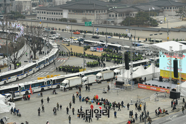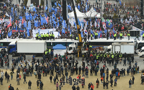 박근혜정권퇴진비상국민행동이 1일 오후 5시부터 광화문 앞 광장에서 촛불집회를 앞두고 집회 참가자들이 모이고 있다. 이날 오전 11시부터 세종로 사거리 일대에는 기독교단체의 구국기도회와 오후 2시부터 대통령탄핵기각을위한국민총궐기운동본부(탄기국)이 제15차 태극기 집회를 진행하고 있다. 경찰은 광화문 광장을 중심으로 열리는 촛불집회와 충돌을 방지하기 위해 경찰버스로 차벽을 세워 충돌을 막고 있다.