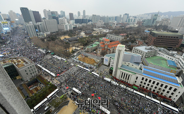 대통령탄핵기각을위한국민총궐기운동본부(탄기국)이 1일 오후 2시부터 세종대로 사거리 일대에서 대규모 태극기 집회를 개최했다. 경찰은 광화문 광장을 중심으로 열리는 촛불집회와 충돌을 방지하기 위해 경찰버스로 차벽을 세워 충돌을 막고 있다.