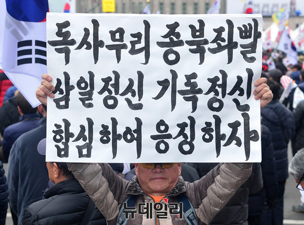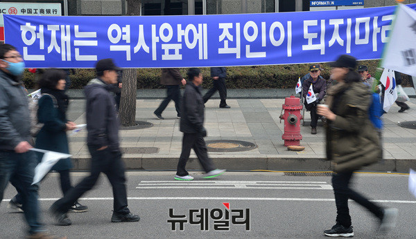 대통령탄핵기각을위한국민총궐기운동본부(탄기국)가 1일 오후 세종대로 일대에서 제15차 태극기집회를 개최한 가운데 "헌재는 역사앞에 죄인이 되지마라"라고 적힌 현수막이 걸려있다.