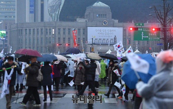 대통령탄핵기각을위한국민총궐기운동본부(탄기국)의 제15차 태극기 집회 참가자들이 1일 오후 세종대로 사거리 일대에서 열린 집회가 끝나고 자진 해산하고 있다. 서울시청에는 "역사를 잊은 민족에게 미래는 없습니다"라는 글귀가 붙었다. 경찰은 광화문 광장을 중심으로 열리는 촛불집회와 충돌을 방지하기 위해 경찰버스로 차벽을 세워 충돌을 막았다.