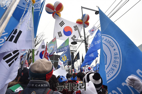 태극기국민운동 및 구국기도회에 참가한 시민들이 1일 오후 서울 종로구 세종로 소공원에 모여 박근혜 대통령 사진을 들고 탄핵무효 구호를 외치고 있다.