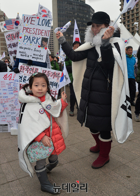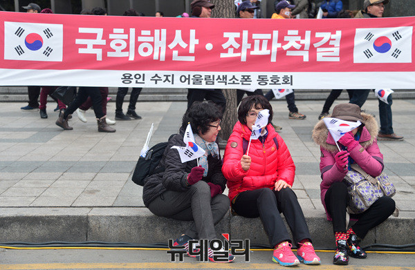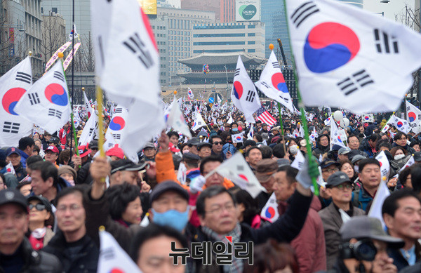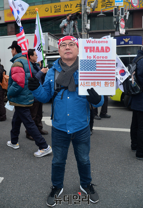 태극기집회에 참석한 한 참가자가 1일 오후 숭례문 인근에서 "사드배치 환영"이라고 적힌 피켓을 들고 있다. 대통령탄핵기각을위한국민총궐기운동본부(탄기국)은 이날 오후 2시부터 세종대로 사거리 일대에서 대규모 태극기 집회를 개최했다.