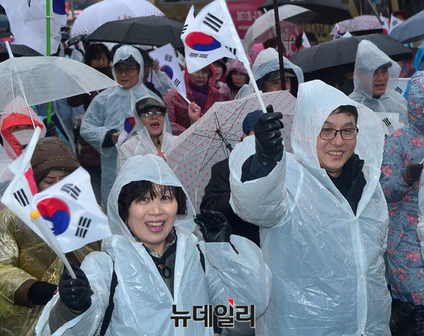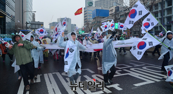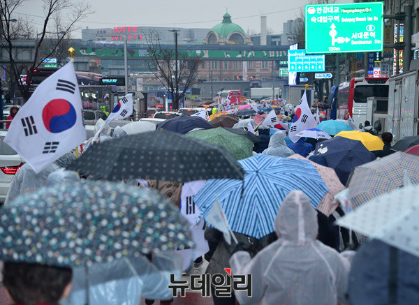 제15차 태극기집회에 참석한 시민들이 1일 오후 집회를 마치고 대형 태극기를 선두로 서울역 방면으로 가두행진을 이어가고 있다. 이날 행진은 대한문을 시작으로 숭례문, 서울역을 거쳐 다시 서울광장으로 돌아왔다.