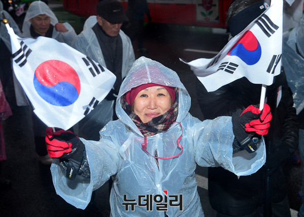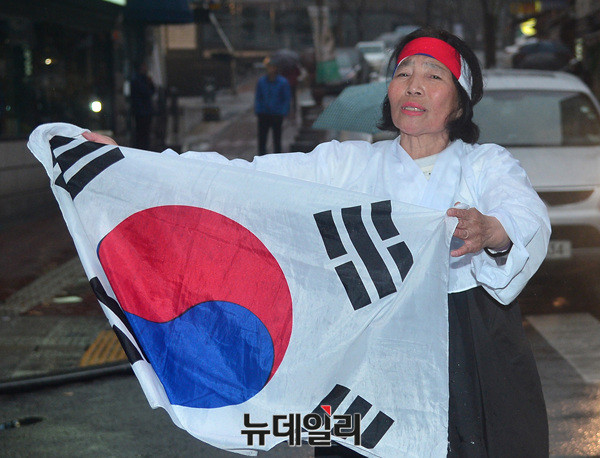 제15차 태극기집회에 참석한 시민이 1일 오후 집회를 마치고 서울시청 방면으로 가두행진을 이어가는 시민들을 응원하고 있다. 이날 행진은 대한문을 시작으로 숭례문, 서울역을 거쳐 다시 서울광장으로 돌아왔다.
