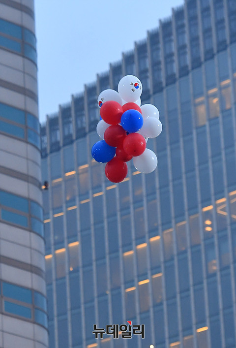 탄핵기각 염원을 담은 풍선이 1일 오후 세종로 사거리에서 열린 대통령탄핵기각을위한국민총궐기운동본부(탄기국)의 제15차 태극기 집회 중 하늘로 올라가고 있다. 풍선에는 태극기가 곳곳에 새겨져 있다.