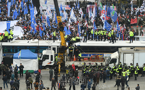 애국단체총협의회와 한국자유총연맹이 1일 오후 세종로소공원에서 3.1절 태극기국민운동을 진행한 가운데 경찰 차벽을 사이에 두고 촛불집회 참석자들과 대치하고 있다. 같은 시각 세종대로 사거리에는 대통령탄핵기각을위한국민총궐기운동본부(탄기국)의 제15차 태극기 집회가 진행됐다.