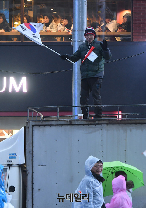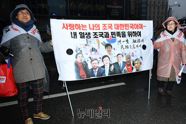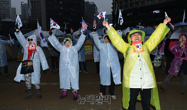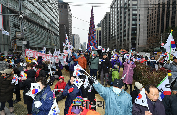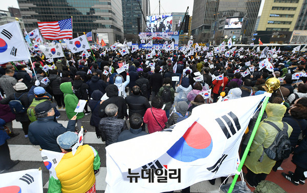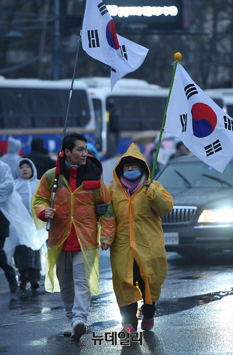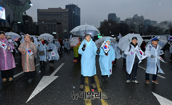 제15차 태극기집회가 1일 오후 세종로사거리에서 진행된 가운데 비가 오는 날씨에도 태극기를 든 참가자들이 청계광장에서 탄핵무효를 외치고 있다. 애국단체총협의회와 한국자유총연맹도 이날 오후 2시부터 세종로소공원에서 3.1절 태극기국민운동을 진행했다.