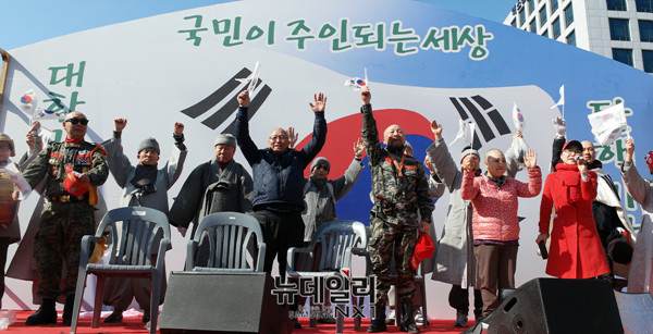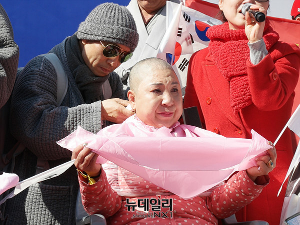 태극기행동본부가 2일 오후 서울 영등포구 국회의사당역 인근에서 대통령 탄핵을 반대하는 기자회견을 열고, 삭발식을 진행했다. 삭발은 총 5명이 참가했다. 이들은 '국회 해산', '인명진 퇴진' 등의 구호를 외치며 자유한국당사 방향으로 가두행진을 이어갔다.