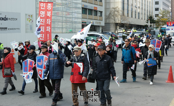 태극기행동본부가 2일 오후 서울 영등포구 국회의사당역 인근에서 대통령 탄핵을 반대하는 기자회견 및 삭발식을 열고, 자유한국당 당사 방향으로 가두행진을 한 뒤, 당사 앞에서 '국회해산', '인명진 퇴진' 구호를 외치고 있다.
