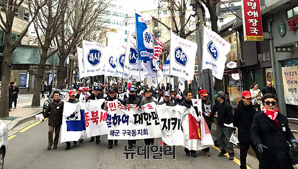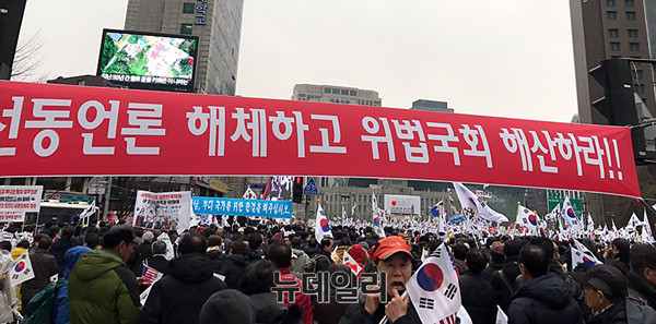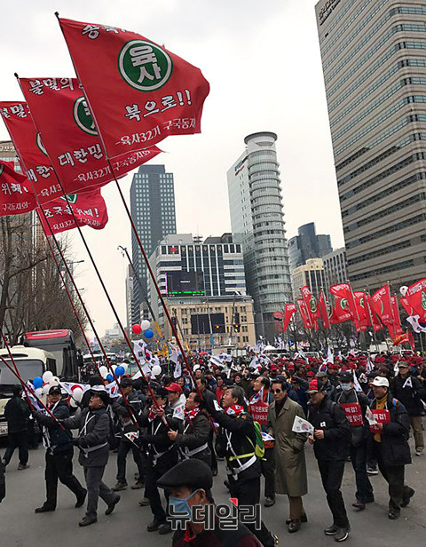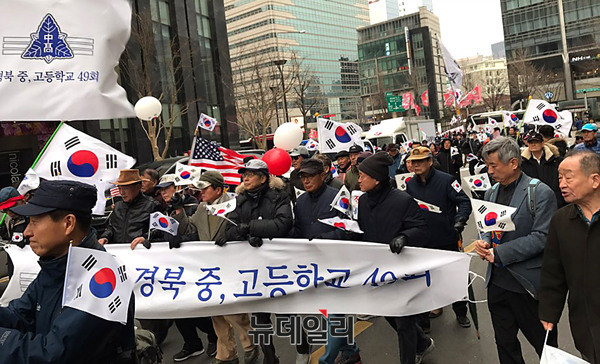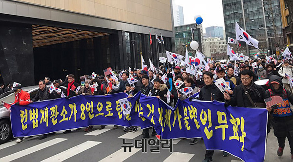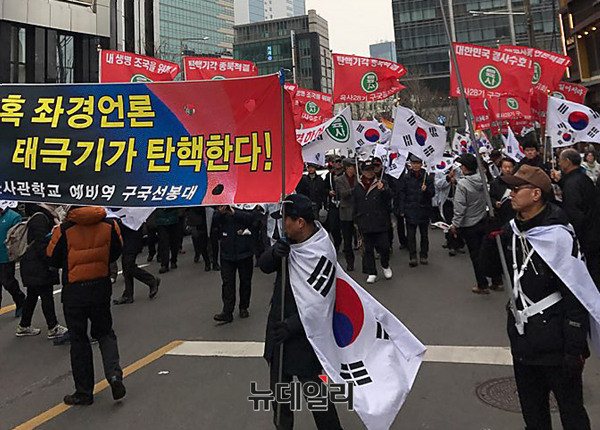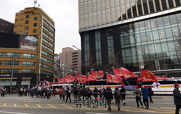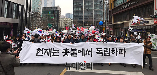 대통령탄핵기각을위한국민총궐기운동본부(탄기국)의 제15차 태극기 집회가 1일 오후 세종로 사거리에서 진행된 가운데 "헌재는 촛불에서 독립하라"는 현수막을 들고 서소문로 방향으로 가두행진을 하고 있다. 집회가 마무리와 함께 5방향으로 나눠 가두행진이 예정이었지만 촛불집회 참가자들과 충돌을 대비해 일부 참석자만 가두행진에 참가했다.