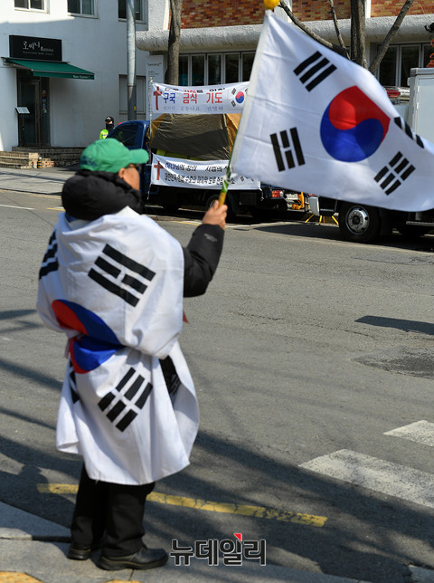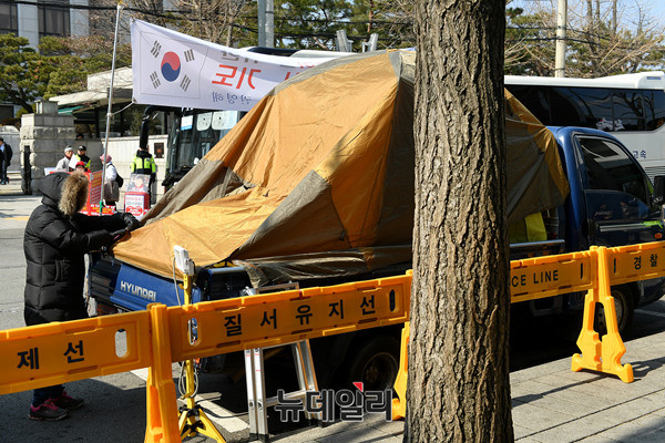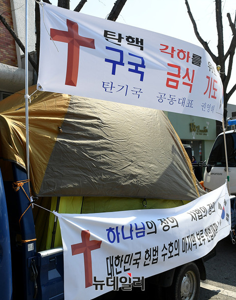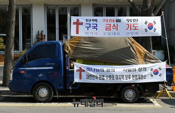 권영해 대통령탄핵기각을위한국민총궐기운동본부(탄기국) 공동대표가 2일 헌법재판소 앞에서 구국금식기도 농성 3일째를 맞았다. 구국금식기도 농성은 헌법재판소 정문 앞에서 화물차량에 텐트를 치고, 텐트 안에서 금식을 하며 성경을 읽고, 기도를 하며 진행되고 있다.