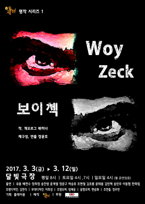 연극 '보이첵'이 오늘(3일) 개막한다.'보이첵'은 24세에 요절한 독일의 작가 게오르그 뷔히너의 미완성 유작이다. 실존인물 '보이첵'이 연인을 살해하고 자신도 목숨을 잃게 되는 실제사건을 바탕으로 만들어진 작품이다.부조리극의 시초로 불리는 '보이첵'은 미완성 작품임에도 불구하고 다양한 재해석을 통해 오페라, 영화에 이어 최근에는 뮤지컬로도 발표된 바 있다.연극 '보이첵'은 '극단 등대 명작시리즈' 첫 번째 작품으로, 연출을 맡은 장윤호가 원작이 가지고 있는 날카로운 비판을 담아 재구성했다.가난과 착취, 폭력으로 인해 점점 파멸로 치닫는 세상의 무자비함에 몸부림치며 그 속에서 깨어나는 인간의 본성과 상실에 대해 이야기한다.멸시와 조롱의 대상이 되는 비천한 군인 '보이첵' 역에 유용-배천수, 그의 아내 '마리' 역에는 장희정-송진영이 더블 캐스팅됐다. 이 외에도 윤계열과 허승호, 조현철 등 대학로의 젊은 배우들이 무대를 채운다.세상과 사랑에 상처받은 약자들의 비애를 담은 연극 '보이첵'은 오는 12일까지 대학로 달빛극장에서 공연되며, 인터파크와 대학로티켓닷컴에서 예매 가능하다.[사진=플레이몽]