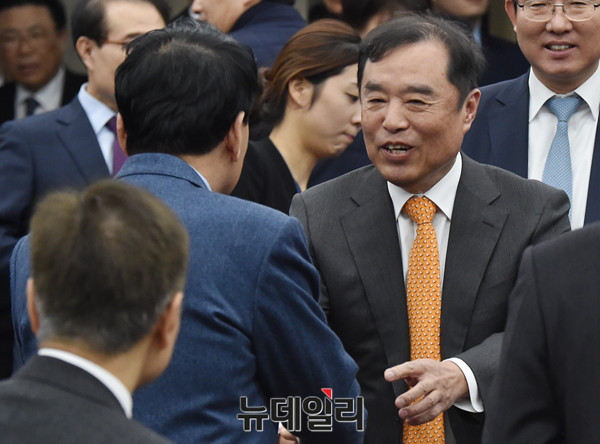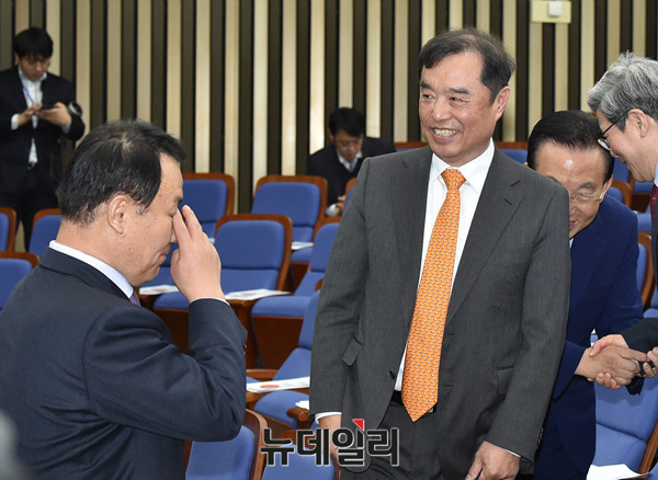 김병준 국민대학교 교수가 3일 오후 국회에서 열린 자유한국당 당협위원장 연석토론회에 강사로 참석해 인사를 나누고 있다.