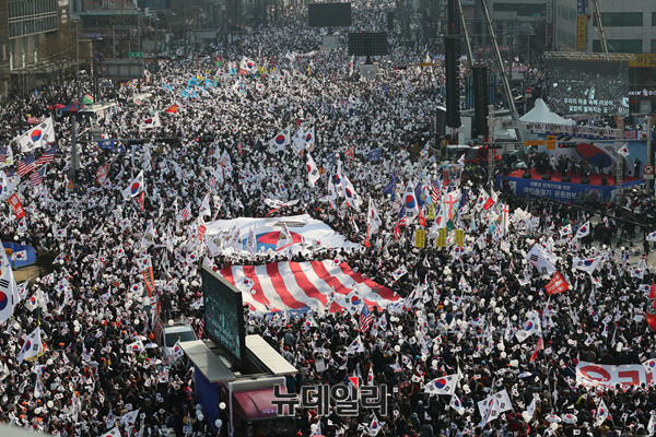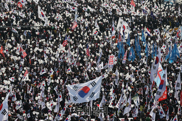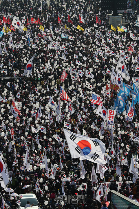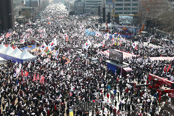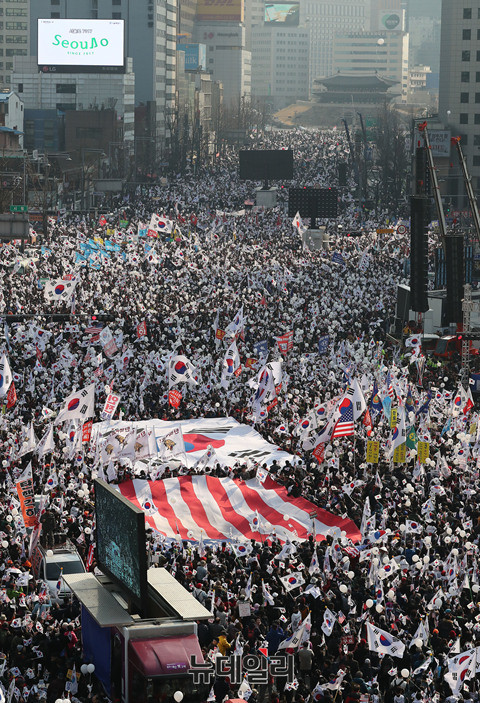 대통령탄핵기각을위한국민총궐기운동본부(탄기국) 제16차 태극기 집회가 4일 오후 2시부터 대한문에서 열린 가운데 서울광장과 대한문, 숭례문까지 태극기를 든 인파로 가득찼다. (사진=공동취재단)