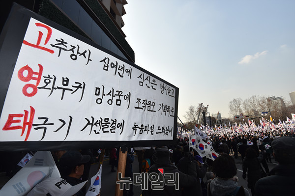 대통령탄핵기각을위한국민총궐기운동본부(탄기국) 제16차 태극기 집회가 4일 오후 2시부터 대한문에서 열린 가운데 한 시민이 고영태를 비판하는 3행시를 들고 있다.