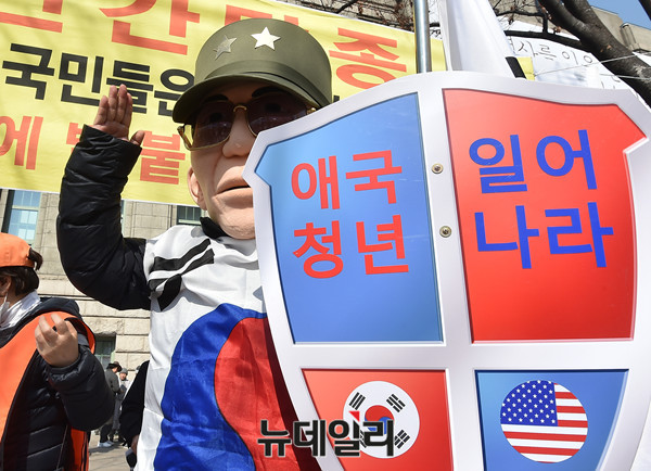 대통령탄핵기각을위한국민총궐기운동본부(탄기국) 제16차 태극기 집회가 4일 오후 2시부터 대한문에서 열린 가운데 한 시민이 故 박정희 전 대통령 인형탈을 쓰고 청년들의 태극기 집회 참여를 호소하고 있다.