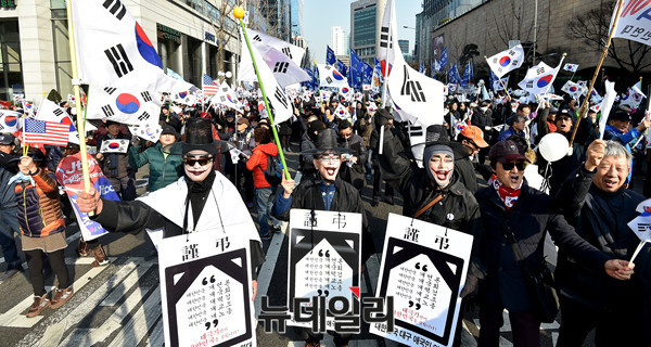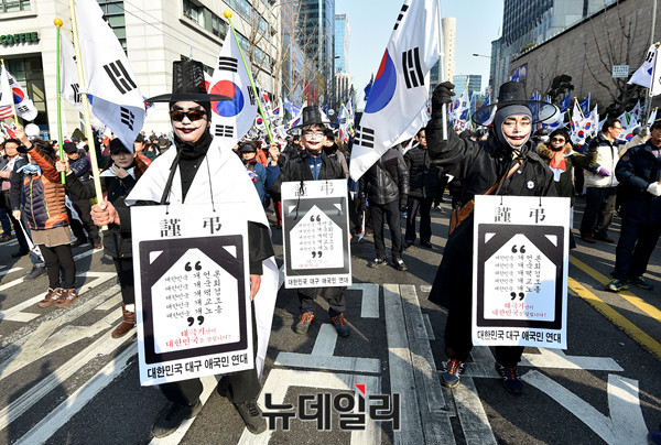 대통령탄핵기각을위한국민총궐기운동본부(탄기국) 제16차 태극기 집회가 4일 오후 2시부터 대한문에서 열린 가운데 참석자들이 저승사자 분장을 하고 탄핵기각을 외치고 있다.