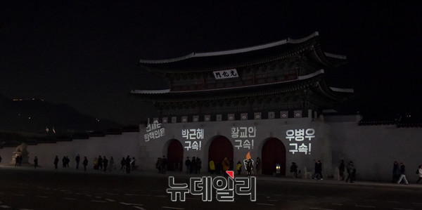 19차 촛불집회가 3일 오후 서울 종로구 광화문광장에서 열린 가운데 일부 시위 참가자들이 경복궁 외벽에 박근혜 구속, 우병우 구속 등 구호가 담긴 레이저를 발사하고 있다.