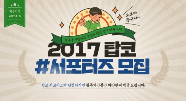 웹툰 플랫폼 탑툰을 서비스하는 종합 콘텐츠 기업 탑코가 공식 서포터즈 1기를 모집한다.서포터즈 'TOPTOONERS'는 탑코가 운영하는 온라인 마케터 프로그램으로, 4월부터 6월까지 3개월간 온·오프라인 마케팅 활동과 UCC 광고 기획·제작 등에 참여하게 된다.서포터즈에게는 소정의 활동비와 수료증, 기프트 박스를 포함해 매달 탑툰의 작품을 감상할 수 있는 코인이 제공되며, 매달 우수 서포터즈에를 선정해 문화상품권을 증정한다. 또, 활동 종료 시 최우수 서포터즈에게는 태블릿 PC를 지급할 예정이다.모집 대상은 소셜 마케터 8명과 영상 제작자 2명이다. 수도권에 거주하는 20세 이상을 대상으로 성별, 대학 재학, 졸업 여부에 관계없이 누구나 지원할 수 있다. 단, 오프라인 활동 불참 시 서포터즈 자격이 박탈될 수 있다.서포터즈는 3월 6일부터 오는 17일까지 접수할 수 있으며, 합격자는 24일 문자로 개별 통보한다. 지원서 다운로드와 보다 자세한 사항은 탑툰 공식 홈페이지의 이벤트 페이지에서 확인할 수 있다.[사진=탑코]