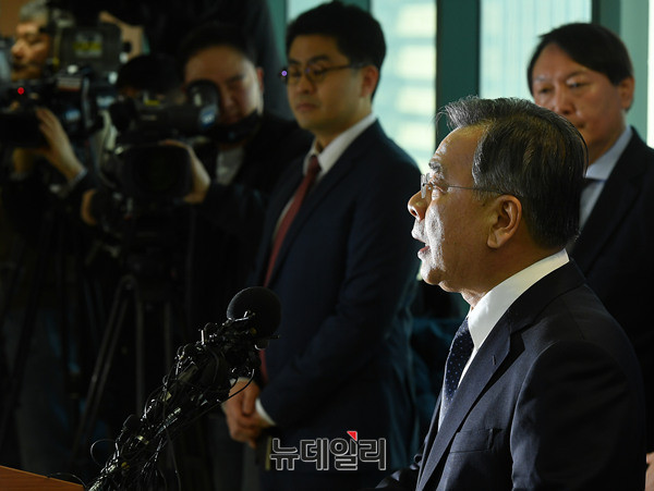 박영수 특별검사가 6일 오후 서울 강남구 대치동에 위치한 특별검사 사무실에서 특별수사 결과 발표를 위해 입장하고 있다. 특검은 지난 달 28일 수사가 종료됐다. 앞서 이날 오전 김진태, 강효상, 전희경 자유한국당 의원들은 특검 수사 결과 발표에 대해 기자회견을 열고, "헌재 판결에 영향을 끼치겠다는 저의"라면서 강도높게 비판했다.