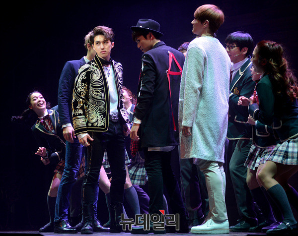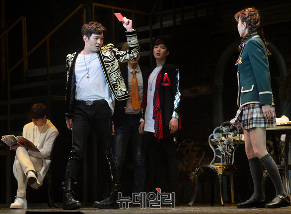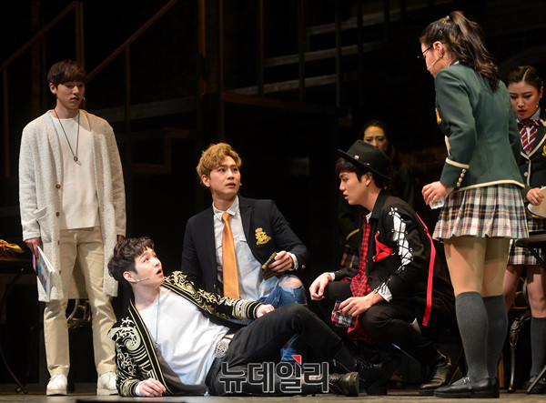 뮤지컬 '꽃보다남자 The Musical'의 출연배우들(이창섭, 제이민, 정휘, 김태규, 장지후, 최이지, 이다솜)이 6일 오후 서울 홍익대 대학로 아트센터대극장에서 열린 프레스콜에서 하이라이트 장면을 시연하고 있다.