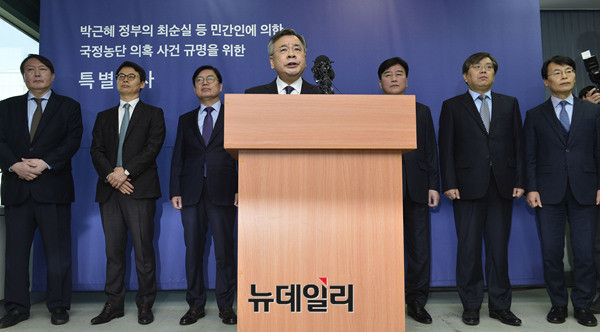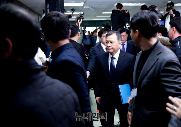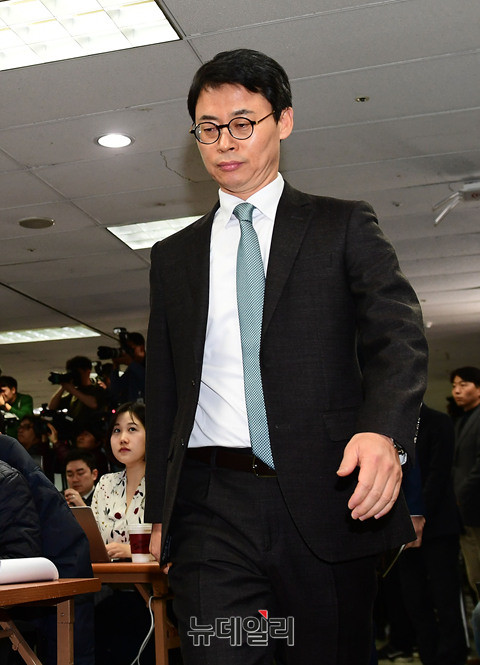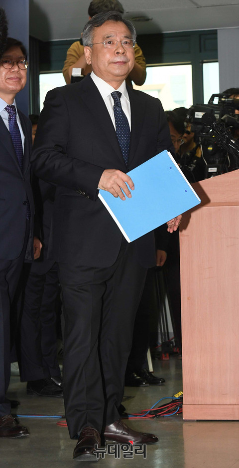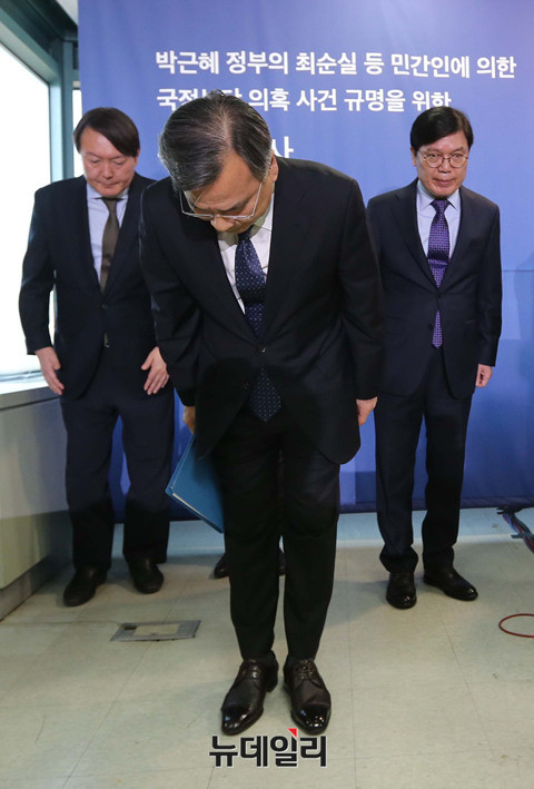 박영수 특별검사팀이 6일 오후 서울 강남구 대치동에 위치한 특별검사 사무실에서 특별수사 결과 발표를 위해 입장하고 있다. 특검은 지난 달 28일 수사가 종료됐다. 앞서 이날 오전 김진태, 강효상, 전희경 자유한국당 의원들은 특검 수사 결과 발표에 대해 기자회견을 열고, "헌재 판결에 영향을 끼치겠다는 저의"라면서 강도높게 비판했다. (사진=공동취재단)