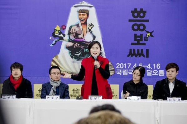 김성녀 예술감독은 7일 오전 국립극장에서 열린 '홍보씨' 제작발표회에서 "안호상 극장장이 적극 지원해줘서 작품을 편하게 했고, 뛰어난 역량의 고선웅 연출이 힘을 실어줬다. 여기에 이자람 같은 국악계 보석이 참여하니 흥보도 아닌데 부자가 된 기분"이라며 "제 임기기간 중 남은 숙제는 오바탕 중 마지막으로 '심청가'를 올리는 것이다"고 말했다.