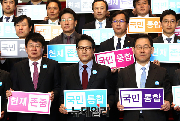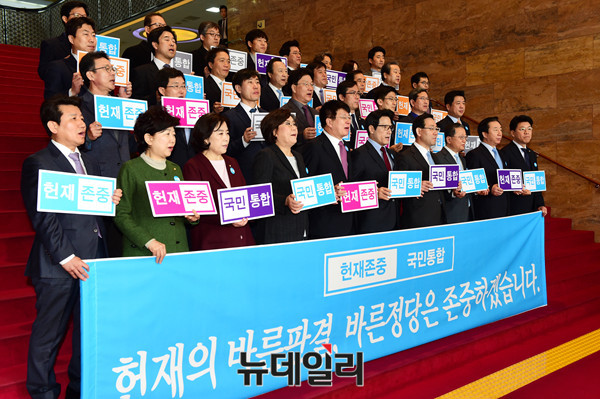 바른정당 정병국 대표를 비롯한 소속의원들이 7일 오전 국회에서 "헌재의 바른판결, 바른정당은 존중하겠습니다"라고 적힌 피켓을 들고 구호를 외치고 있다.