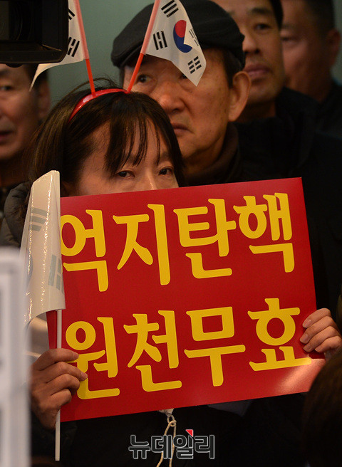 '박영수특검 및 검찰특수본의 범법행위와 인권침해 조사위원회' 출범식에 참석한 시민이 7일 오후 한국프레스센터에서 "억지탄핵 원천무효" 피켓을 들고있다.이날 출범식에는 김평우 변호사, 조원룡 변호사, 도태우 변호사, 김경재 한국자유총연맹 총재 등이 참석해 박영수 특검과 검찰을 규탄했다.