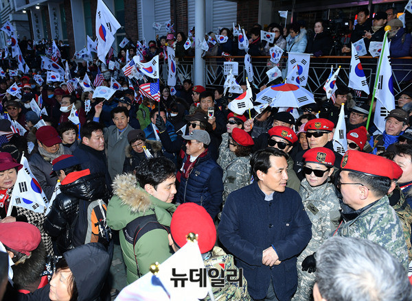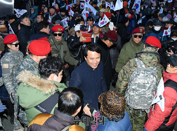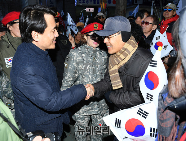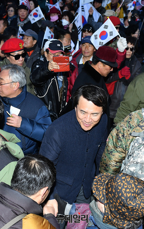 김진태 자유한국당 의원이 8일 오후 헌법재판소 인근 안국역 5번 출구에서 열린 제17차 태극기 집회에 참석해 시민들과 악수를 나누고 있다. 탄기국 측은 이날 오후 4시 안국역 일대에서 제17차 태극기 집회를 열고, 3박 4일간 집회를 이어간다고 밝혔다.