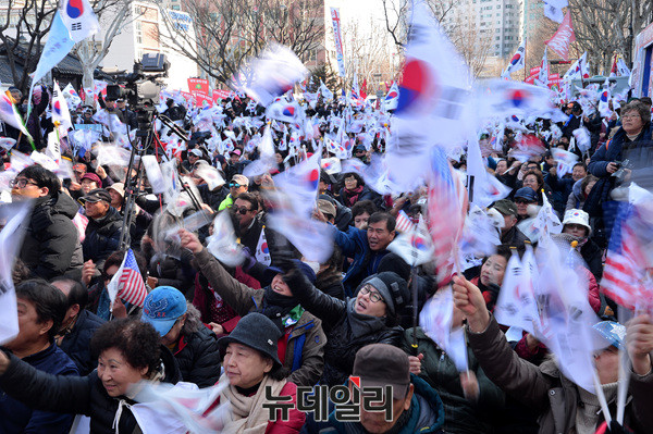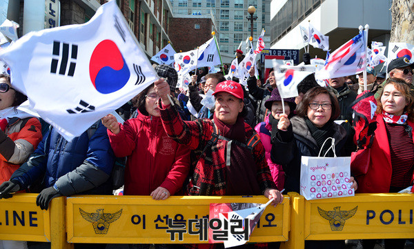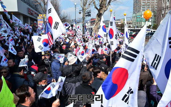 제17차 태극기집회에 참석한 한 참가자가 탄핵심판 선고기일을 하루 앞둔 9일 오후 안국역 인근에서 "탄핵반대 특검 인민재판식 마녀사냥 멈춰라"고 적힌 피켓을 들고 있다. 대통령탄핵기각을위한국민총궐기운동본부(탄기국)은 이날 오후 2시부터 안국역 일대에서 대규모 태극기 집회를 개최했다.