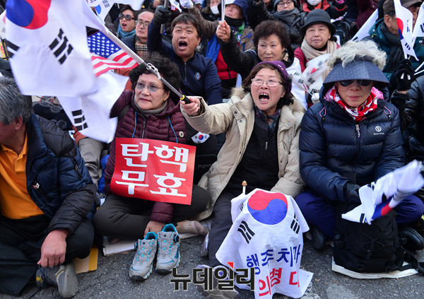 제17차 태극기집회에 참석한 한 참가자가 탄핵심판 선고기일을 하루 앞둔 9일 오후 안국역 인근에서 태극기와 성조기를 흔들며 "탄핵각하"를 외치고 있다.대통령탄핵기각을위한국민총궐기운동본부(탄기국)은 이날 오후 2시부터 안국역 일대에서 대규모 태극기 집회를 개최했다.
