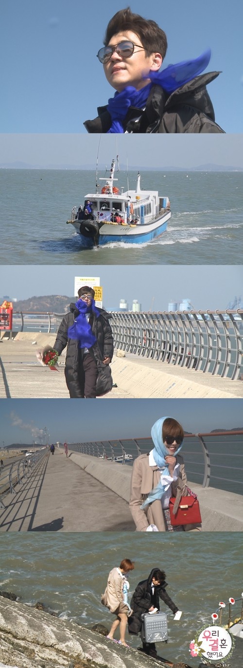 '우결' 최민용-장도연의 첫 만남 현장이 포착됐다.11일 방송될 MBC '우리 결혼했어요'(이하 '우결')에서는 새로운 커플로 합류한 최민용-장도연의 특별한 첫 만남이 공개될 예정이다.최민용-장도연의 첫 만남은 푸른 바다 위 섬마을에서 이뤄졌다. 최민용은 배를 타고 망망대해를 건너 아내를 찾아 나섰고, 장도연은 빨간 등대 앞에서 매서운 칼바람에 어쩔 줄 몰라하며 남편을 기다렸다.최민용은 턱시도에 선글라스, 빨간 꽃다발까지 준비하고 뱃머리 위에 당당히 서서 바다를 가르며 설레는 마음을 안고 아내가 있는 섬으로 향했다. 장도연도 꽃하이힐을 신고 핑크빛 신혼 생활을 꿈꾸며 잔뜩 긴장한 모습을 보였다.사진 속 최민용과 장도연의 모습은 휘몰아치는 칼바람에 사방으로 휘날리는 머리카락과 스카프로 이들의 순탄치 않은 섬마을 신혼 생활을 예고한다. 반면 두 사람은 고개를 숙이고 연신 웃음을 참지 못하면서도 서로를 힐끔 바라보며 묘한(?) 기류를 발산하고 있다.신혼집이 '국화도'라는 섬에 있다는 소식에 최민용은 환하게 웃으며 "섬 생활.. 괜찮아요?"라며 물었고, 이에 장도연은 "이제와서 무를 거예요?"라며 지지 않는 입담으로 응수해 범상치 않은 커플 케미를 뽐냈다.새 커플 최민용-장도연의 스펙터클한 첫 만남 현장은 11일 오후 4시 55분 '우리 결혼했어요'에서 확인할 수 있다.['우리결혼했어요' 최민용 장도연, 사진=MBC]
