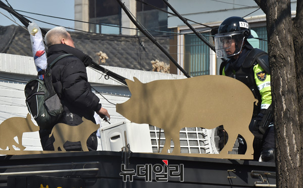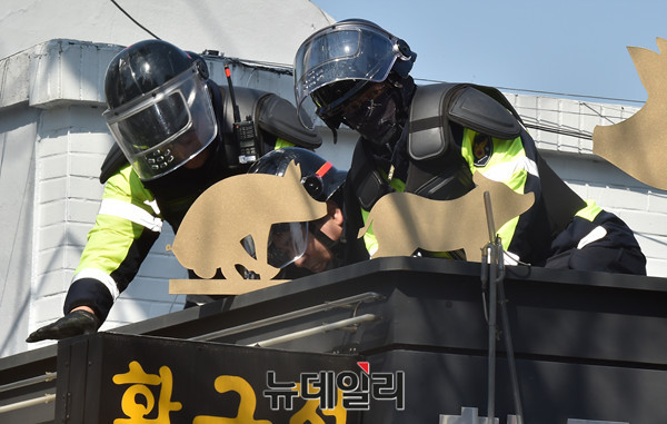 박근혜 대통령 탄핵이 인용 된 10일 오전 서울 종로구 안국역 인근에서 헌번재판소로 행진하려는 대통령탄핵기각을위한국민총궐기운동본부(탄기국) 측 한 참가자가 인근 상가옥상을 통해 헌재로 진입하려 하자 경찰이 이를 제지 하고 있다.